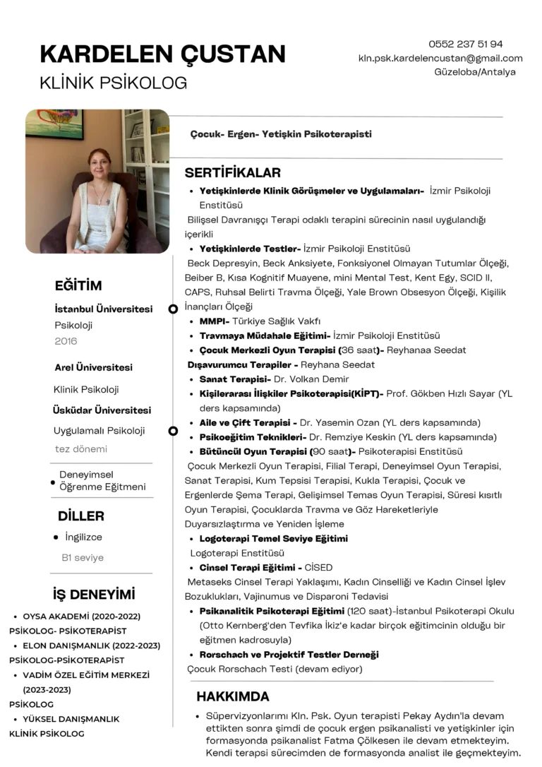 2016’dan beri alanda olup İstanbul’da birçok Psikiyatri ve Psikoterapi kliniğinde çalışmış ve memleketi olan Antalya’ya 2024 Ekim ayında geri dönmüştür.
